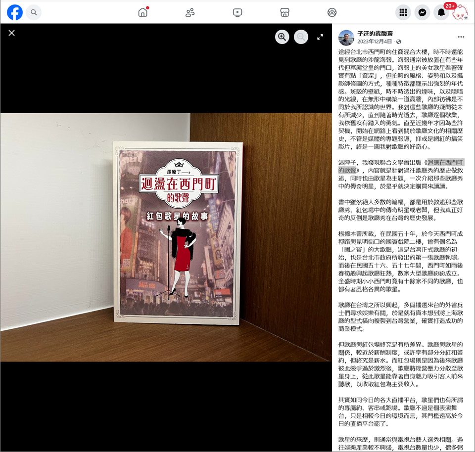最近、聯合文芸社から『西門町に響く歌』という本が出版されていることを知りました。この本はキャバレーショーの歴史を紐解き、伝説のキャバレースターを特集した歌手の特集記事です。そこで購入して読んでみることにしました。