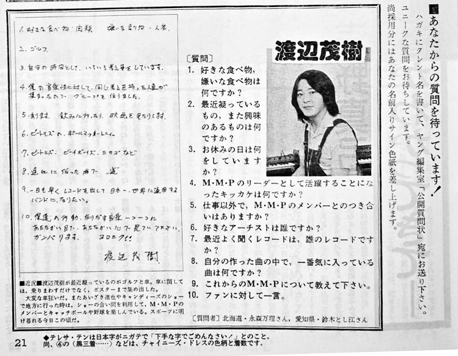 テレサ・テン、渡辺茂樹ともに渡辺プロの所属したことがあり、渡辺プロの会報「月刊ヤング」1976年10月号では、同じページで記事が紹介されています。