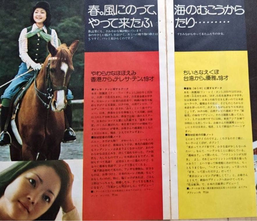 日本でのデビューは1974年3月1日。誕生日は1953年1月29日なので、21歳になったばかりでしたが、「アイドル」として売り出すには20代よりも「10代」の方が良かったのでしょう。「香港出身」という謳い文句に加え、「19歳」として発表されました。