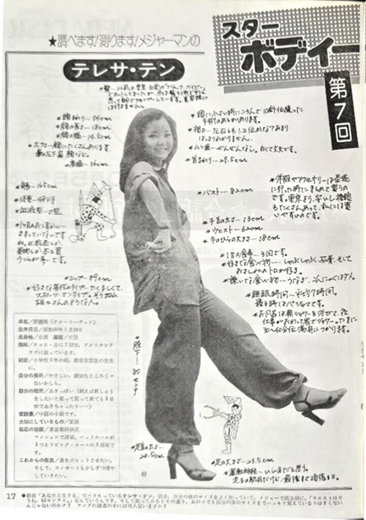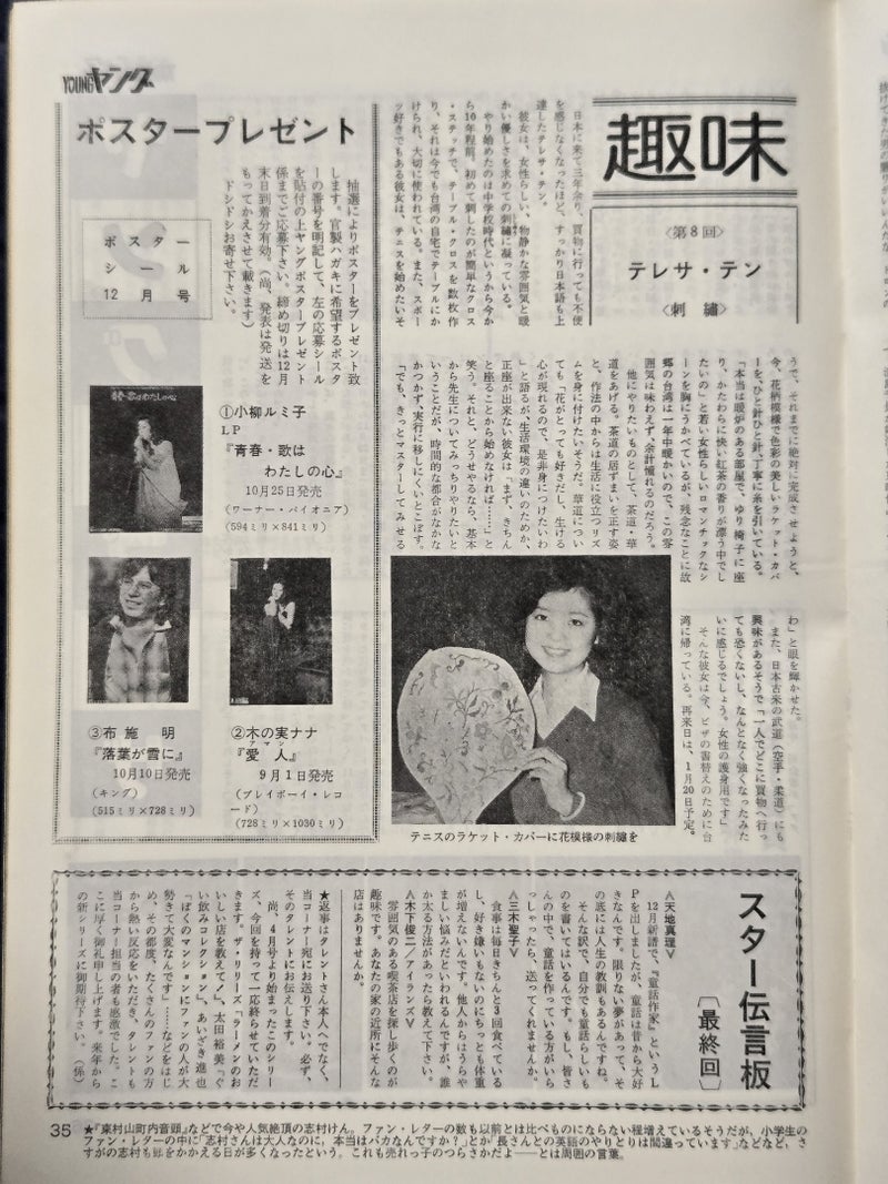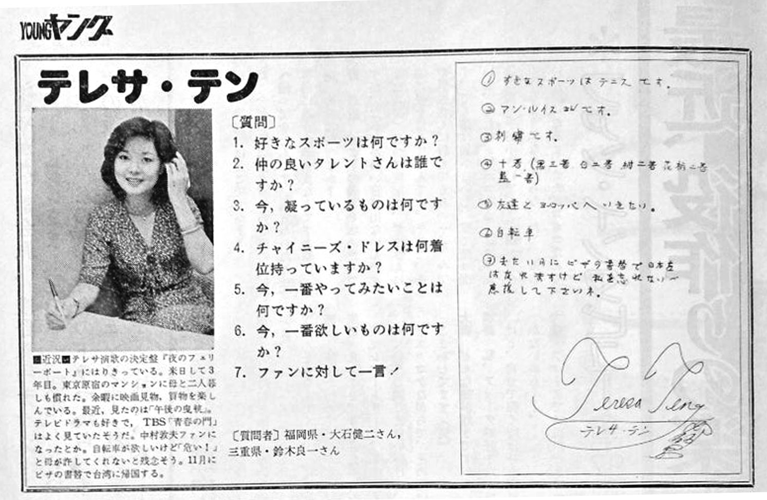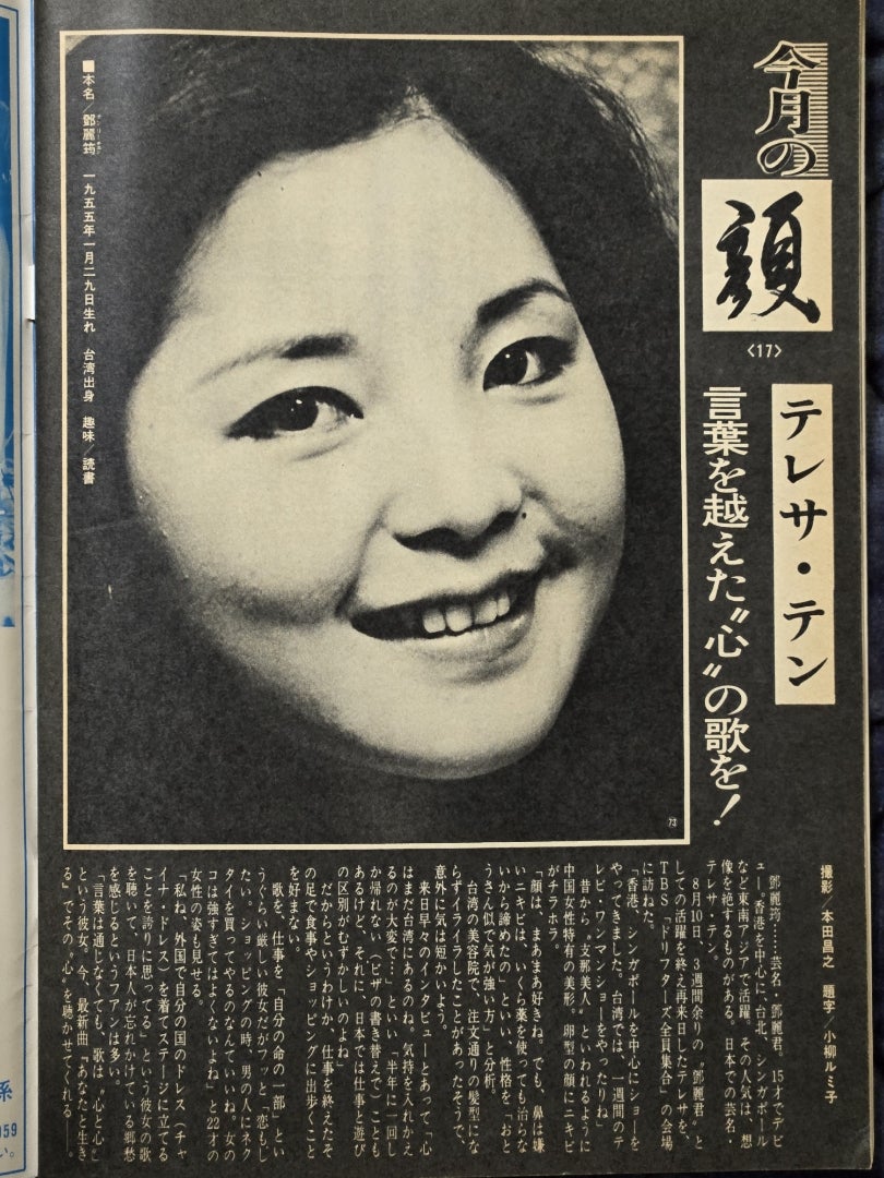 ■近況■テレサ演歌の決定盤『夜のフェリーボート』にはりきっている。来日して3年目。東京原宿のマンションに母と二人暮しも慣れた。余暇に映画見物、買物を楽しんでいる。最近、見たのは「午後の曳航」。テレビドラマも好きで、TBS「青春の門」はよく見ていたそうだ。中村敦夫ファンになったとか。自転車が欲しいけど「危い!」と母が許してくれないと残念そう。11月にビザの書替で台湾に帰国する。